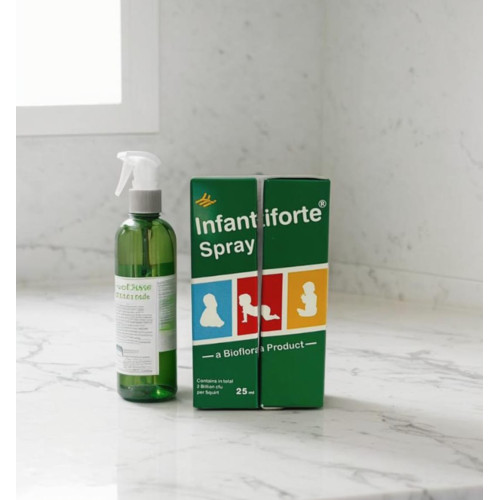 METHOD OF ACTION: INFANTIFORTE® Spray contains lyophilised cells of Bifidobacterium infantis, a species which is a natural inhabitant of the infant's intestinal tract. INFANTIFORTE® Spray is administered to help restore the normal intestinal bifidobacteria destroyed by antibiotics, to support a healthy digestive system and to balance normal bowel flora.